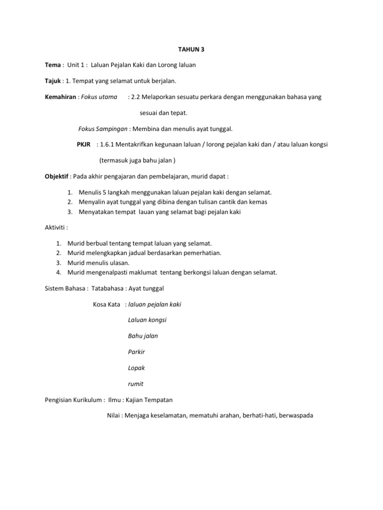 Pendidikan Keselamatan Jalan Raya Sekolah Rendah PKJR bermatlamat untuk memberikan pengetahuan dan kemahiran asas tentang keselamatan jalan raya bagi melahirkan generasi pengguna jalan raya yang berhemah. RPT BAHASA MELAYU TAHUN 3 2022 2023 by rozayus academy 1. Masa penyerapan Pendidikan Keselamatan Jalan Raya adalah minimum 30 minit dalam tempoh seminggu.